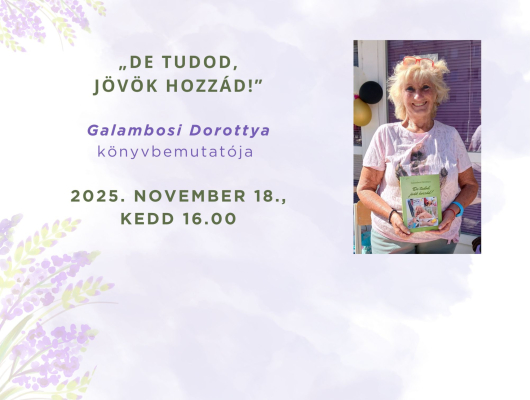 „De tudod, jövök hozzád!” címmel jelent meg Galambosi Dorottya könyve. A kötet 2025. november 18-án, kedden 16.00 órakor mutatjuk be a József Attila Könyvtárban (3526 Miskolc, Szentpéteri kapu 95.)- A részletekről a képre kattintva olvashat.