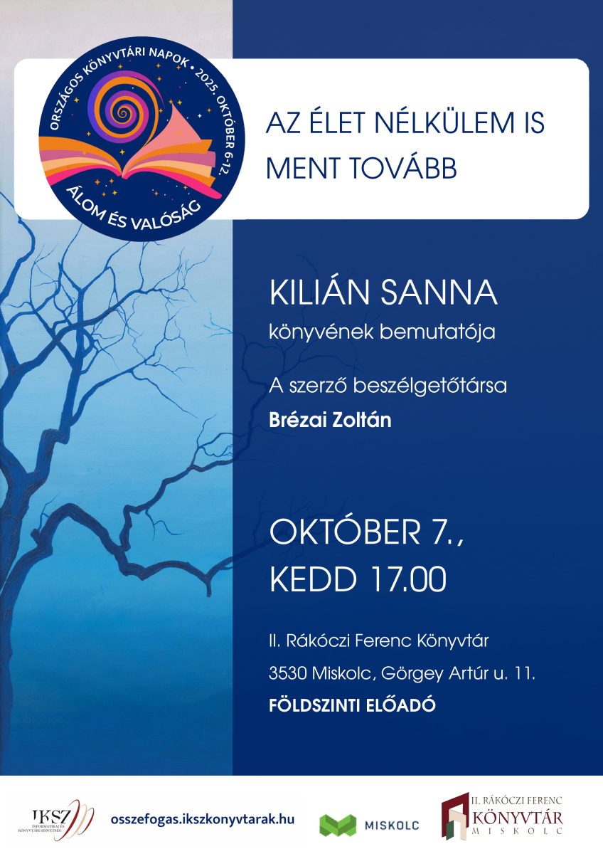 Kilián Sanna idén megjelent regényét  Az élet nélkülem is ment tovább című kötetet mutatjuk be 2025. október 7-én, kedden 17 órától a II. Rákóczi Ferenc Könyvtár központi épületében (Miskolc, Görgey u. 11.).