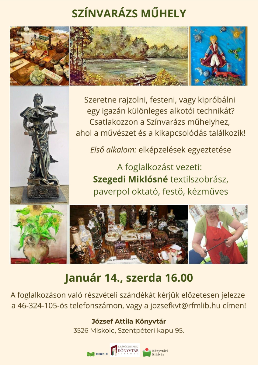 A rajzolni, festeni vágyókat, valamint egy igazán különleges alkotói technika iránt érdeklődőket várja a Színvarázs műhely. Az első foglalkozásra január 14-én szerdán, délután 4 órától kerül sor a József Attila Könyvtárban (3526 Miskolc, Szentpéteri kapu 95.). A foglalkozást Szegedi Miklósné textilszobrász, paverpol oktató, festő, kézműves vezeti. A foglalkozáson való részvételi szándékát kérjük előzetesen jelezze a 46-324-105-ös telefonszámon, vagy a jozsefkvt@rfmlib.hu címen! A műhely az év további részében folytatódik és minden hónap második szerdáján délután 4 órától várja az érdeklődőket.